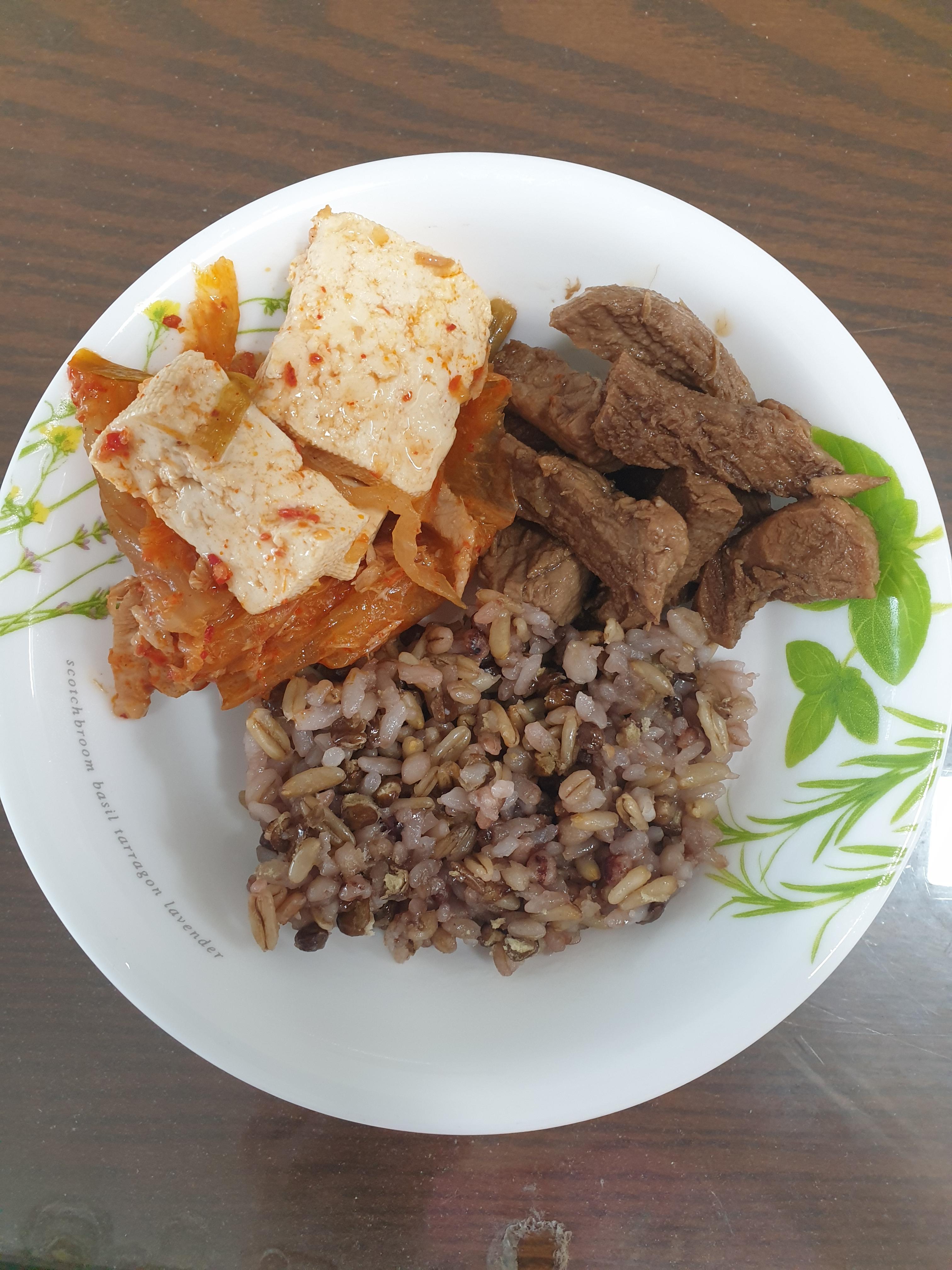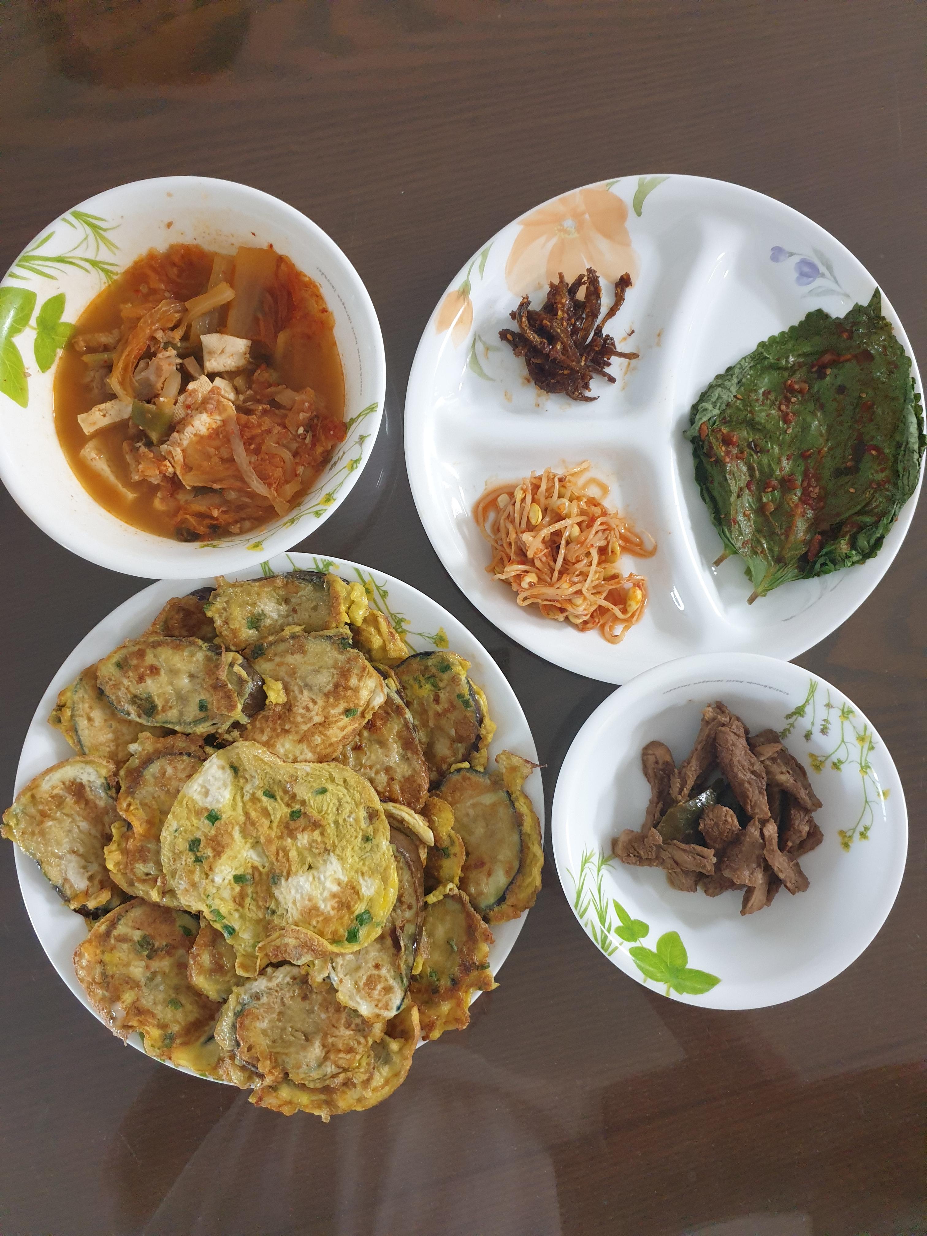 저녁에는 식사 전에 오이 2조각을 먹고, 가지튀김, 김치찌개, 장조림, 깻잎절임으로 식사했습니다. 식사 후에는 비가 와서 실내 운동을 선택했습니다. 까치발 들기 200회, 아령 100회, 한발 서기 2분, 벽 스쿼트 2분으로 근력 운동을 하고, 5,000보를 걸어 하루 총 활동량을 채웠습니다.