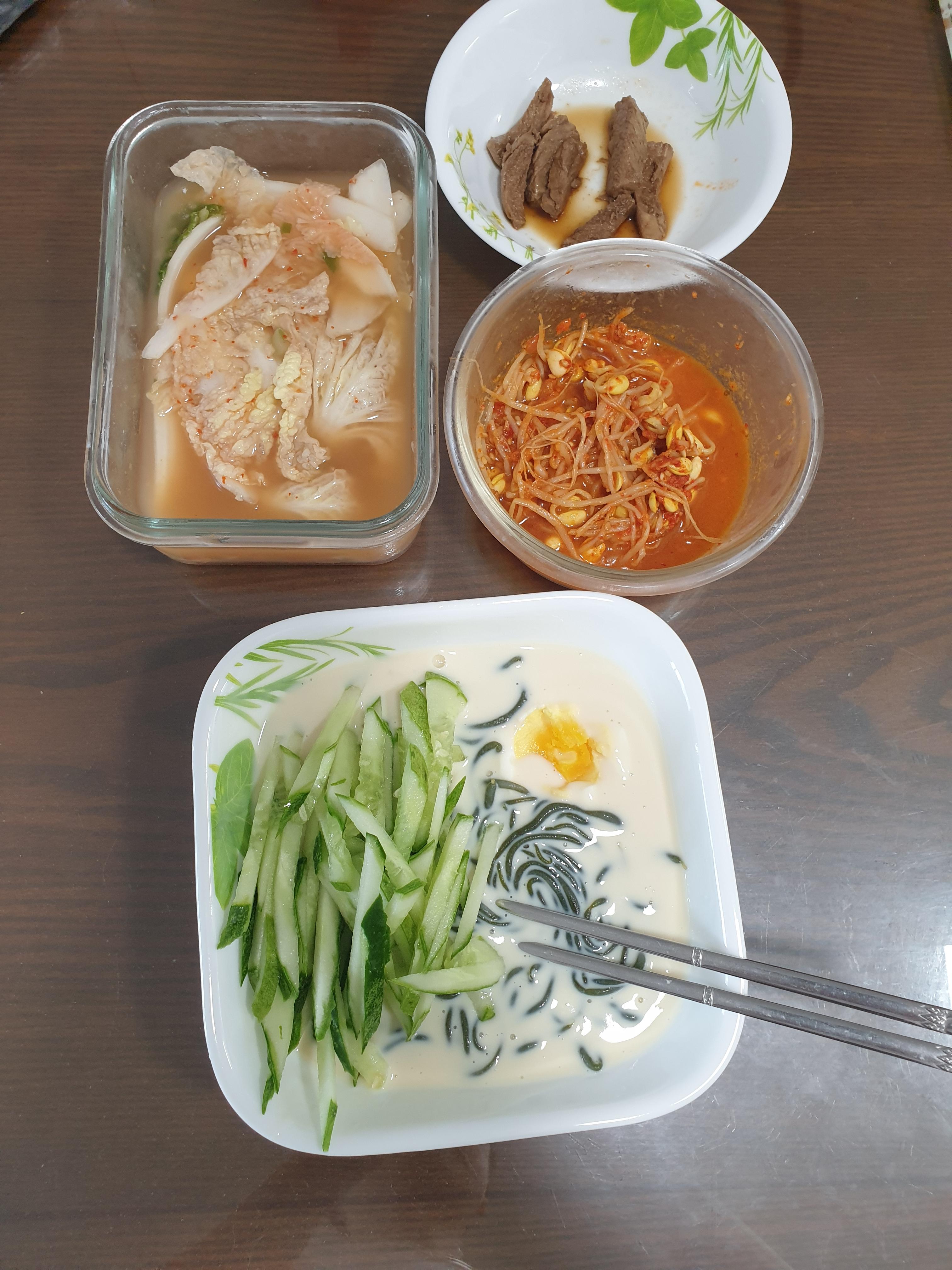 점심은 미역면 콩국수를 먹었습니다. 혈당을 급격히 올릴 수 있는 밀가루 면 대신 미역면을 선택했죠. 식사 전 사과 1개를 먼저 먹어 포만감을 높였습니다. 빵 1조각도 곁들였지만, 점심 식사 후 4,000보 걷기로 활동량을 늘렸습니다. 어제와 같은 식단이라 점심 혈당 측정은 하지 않았습니다.
