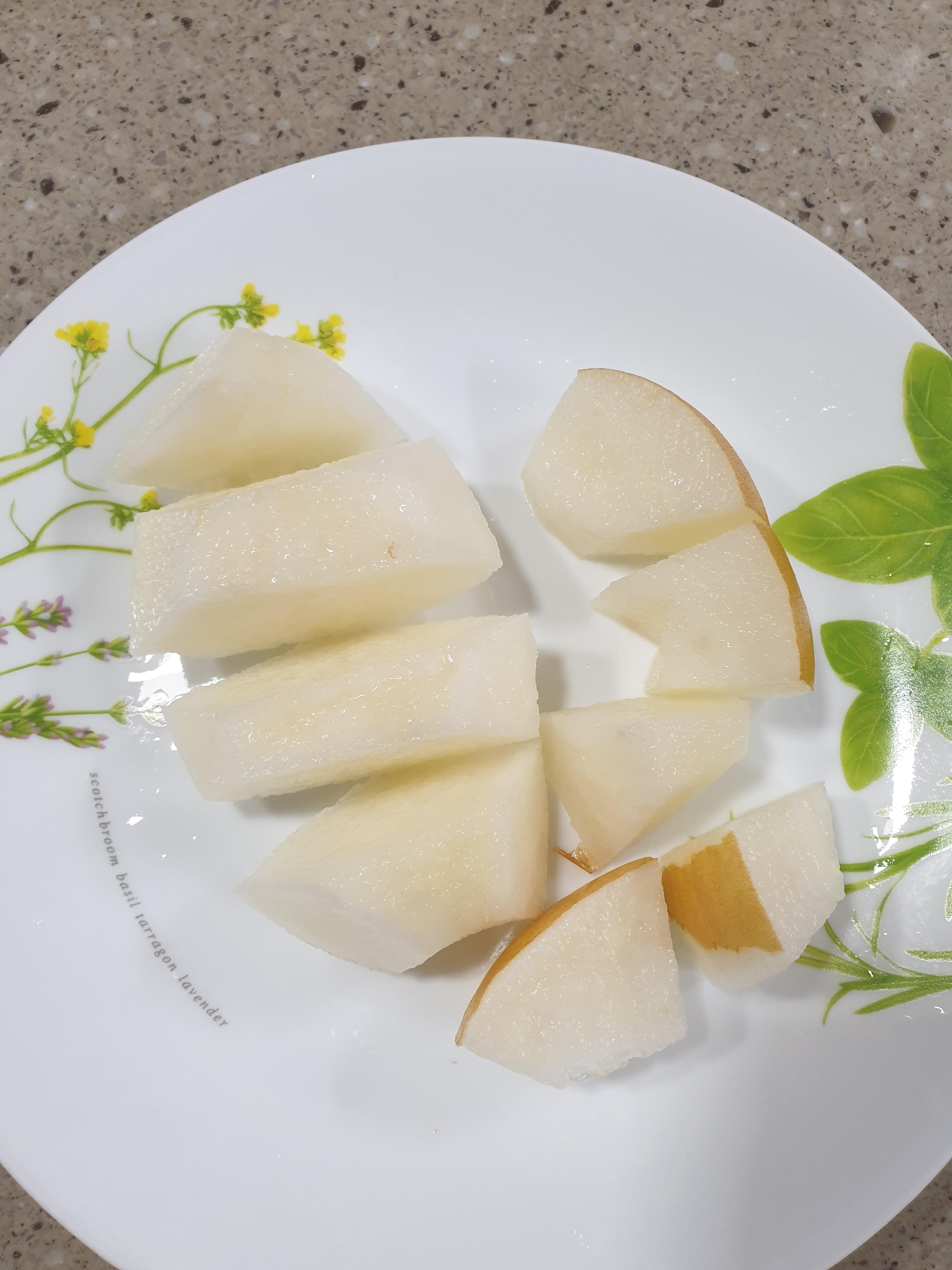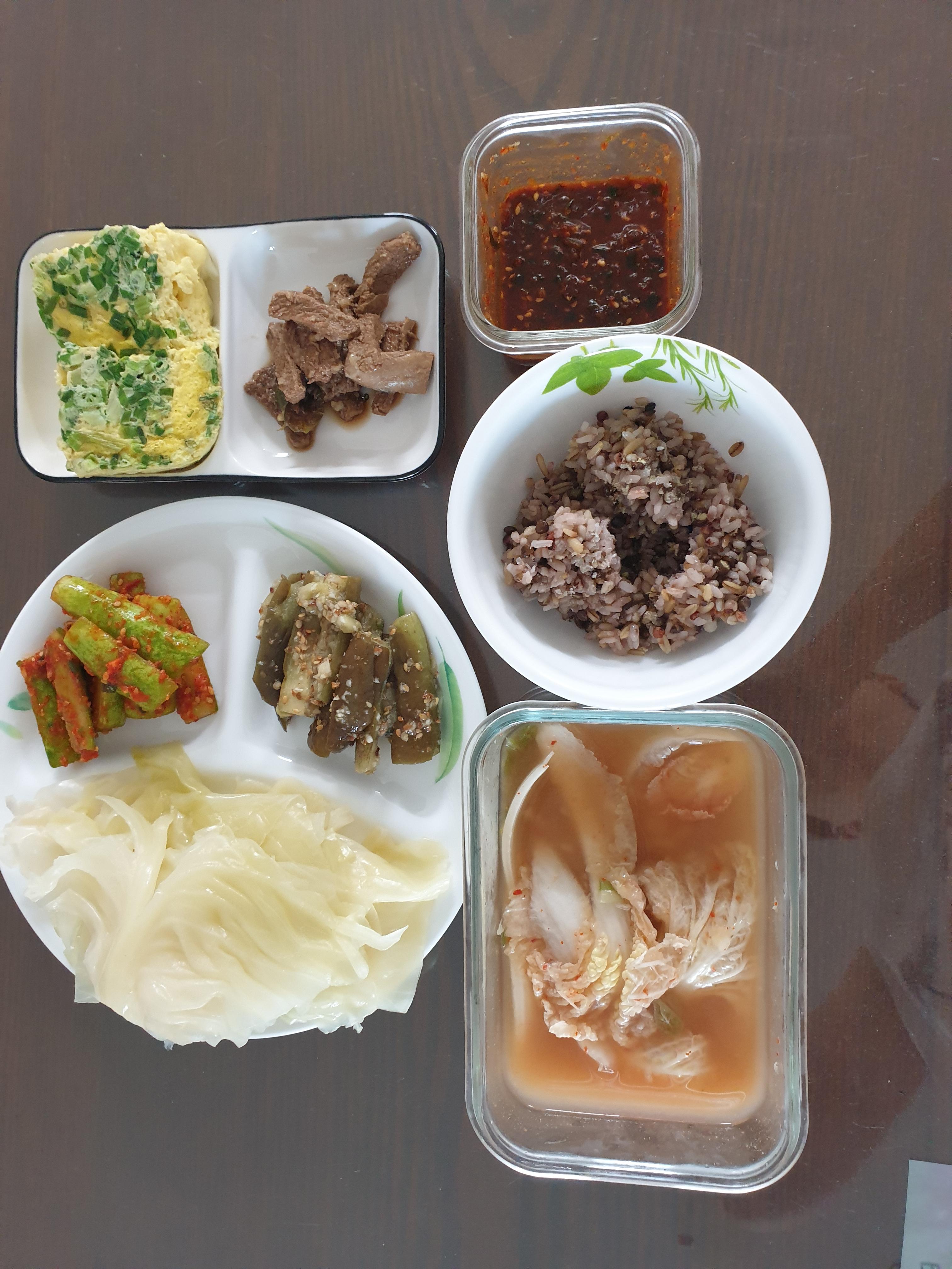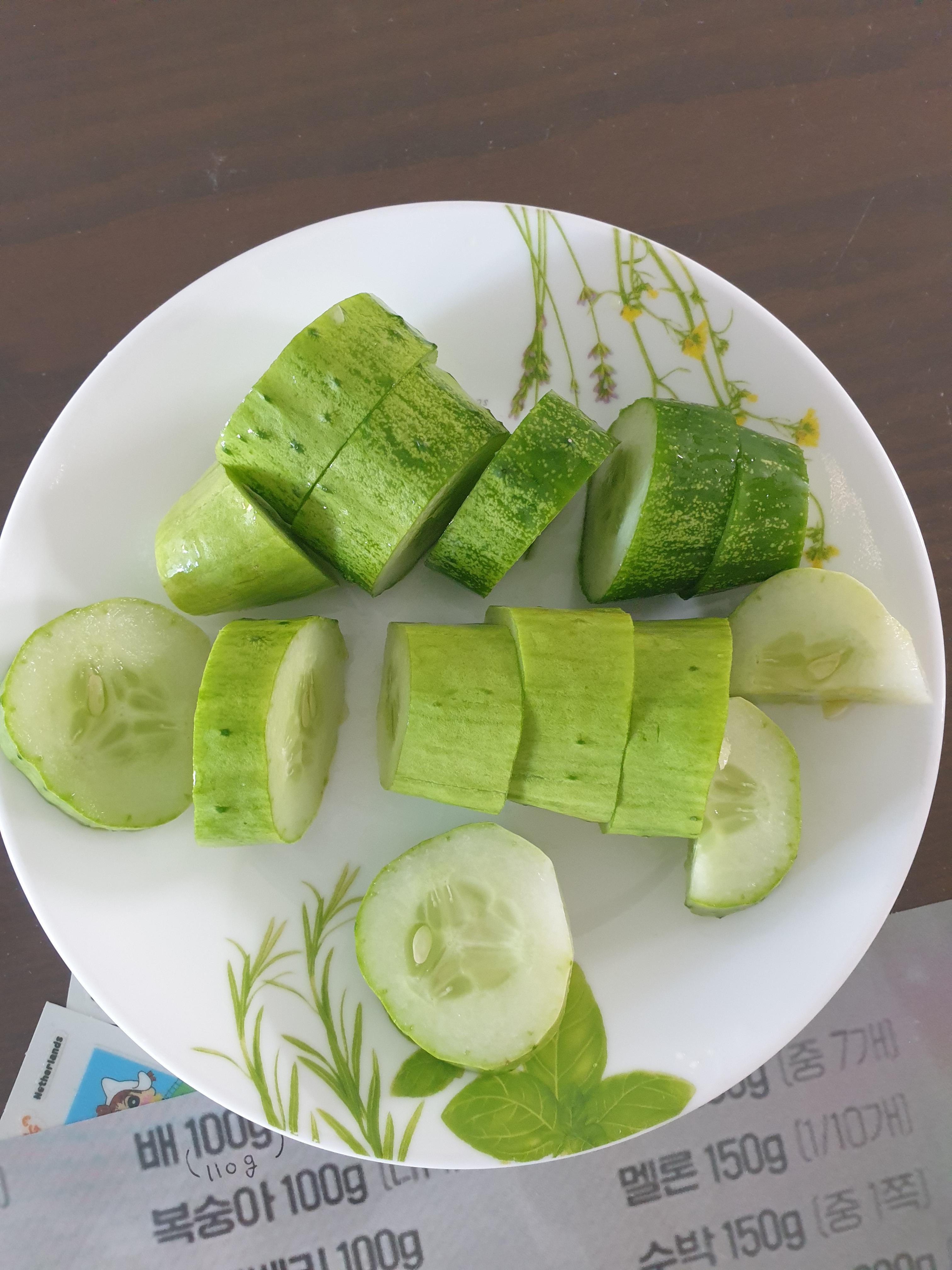 저녁 식사 전 혈당 스파이크를 막기 위해 오이를 먼저 먹었습니다. 이어서 계란찜, 장조림, 오이소박이, 양배추찜, 가지무침, 무김치 등 다양한 반찬과 함께 밥 1/2 공기를 먹었습니다. 식사 후에는 배를 1/2개 먹고 남편과 산책을 나갔고, 인절미 가루만 있는 팥빙수 1그릇을 함께 나누어 먹었습니다.