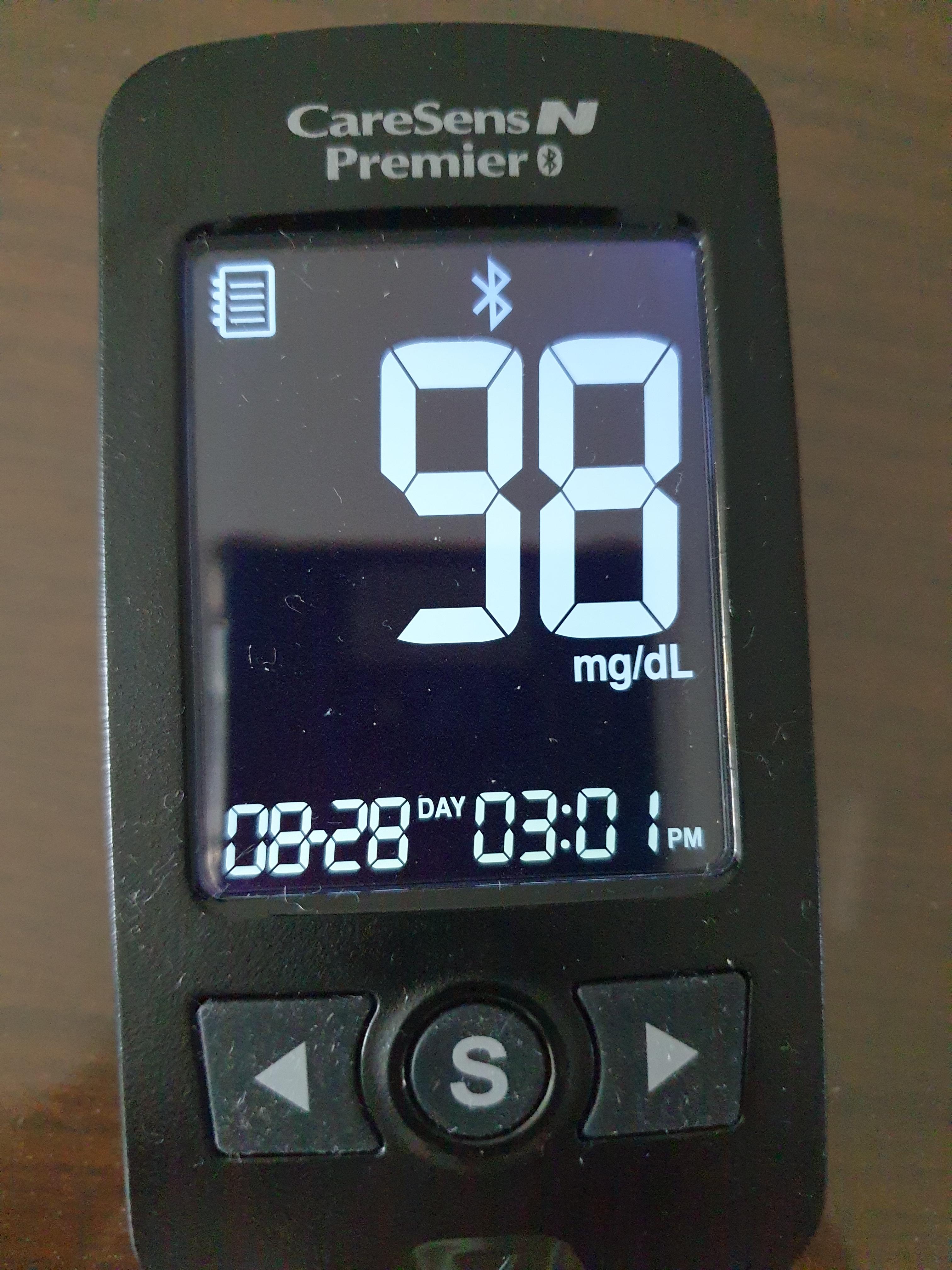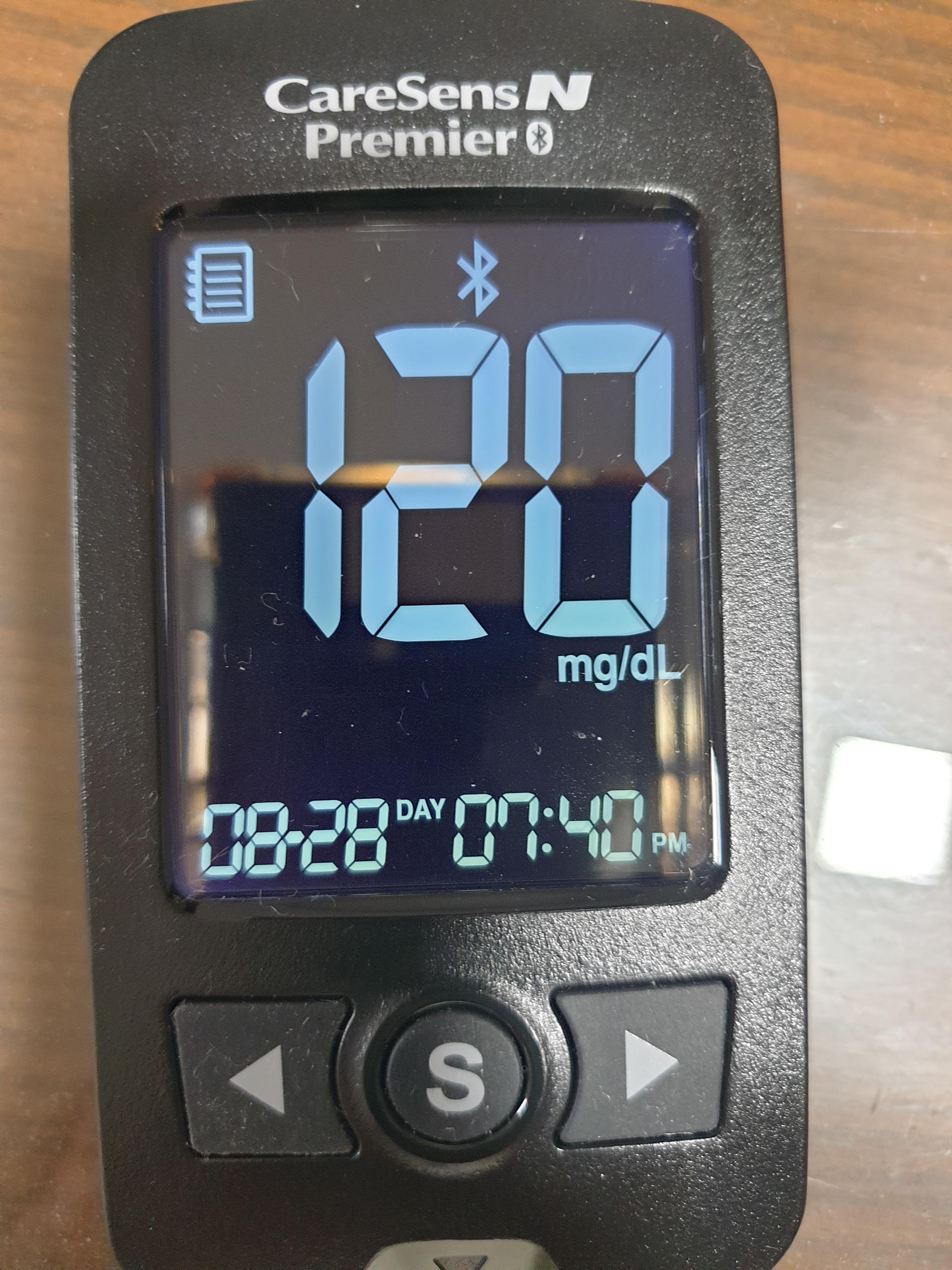 식사 후 집에서 실내 운동을 시작했습니다. 집안에서 5,000보를 걸어 하루 총 1만보를 채웠습니다. 여기에 추가로 아령 100개, 벽 스쿼트 2분 10초, 매달리기 16초를 통해 근력 운동도 병행했습니다. 저녁 식사 2시간 후 혈당을 측정하니 120이 나왔습니다.