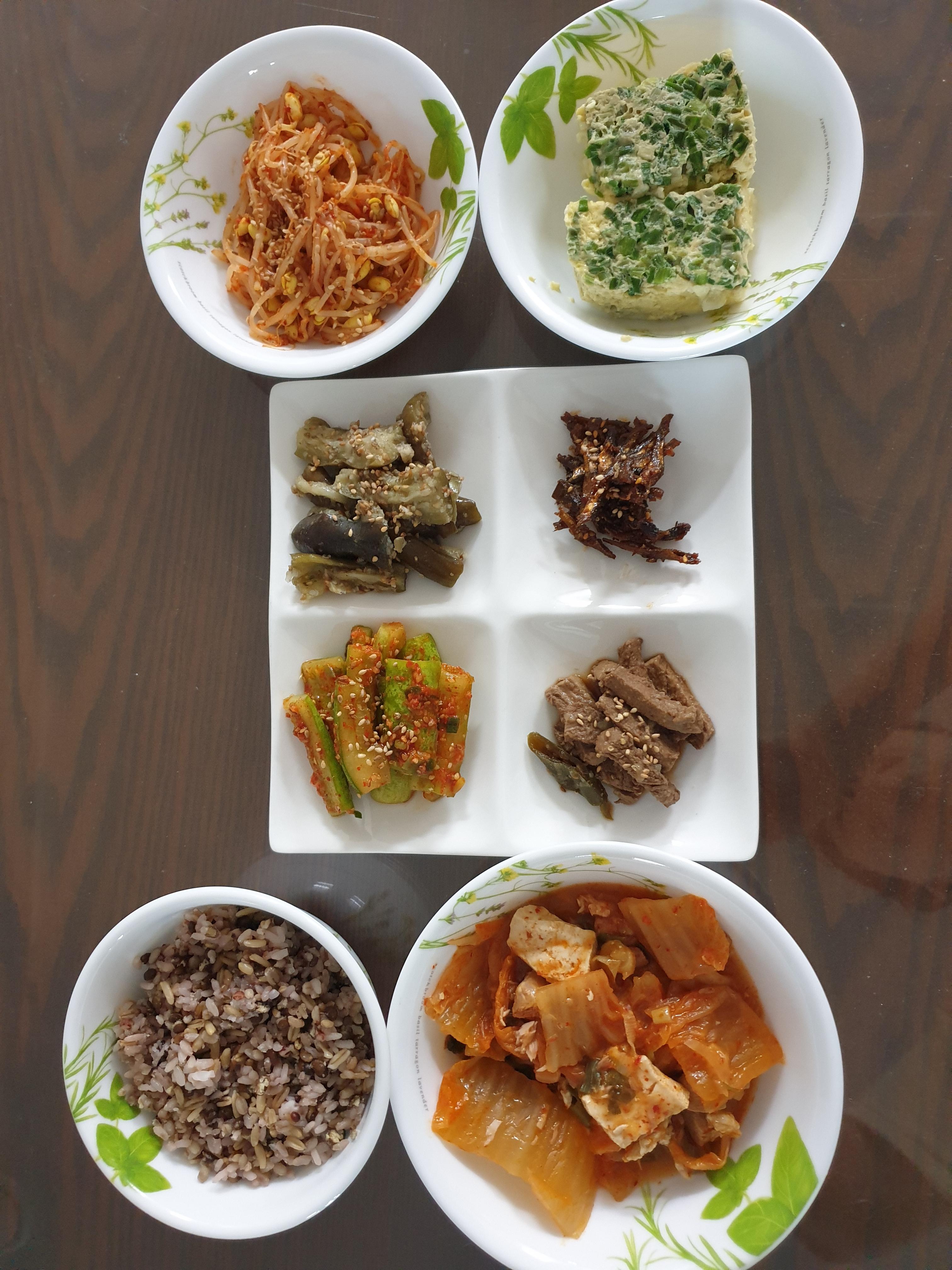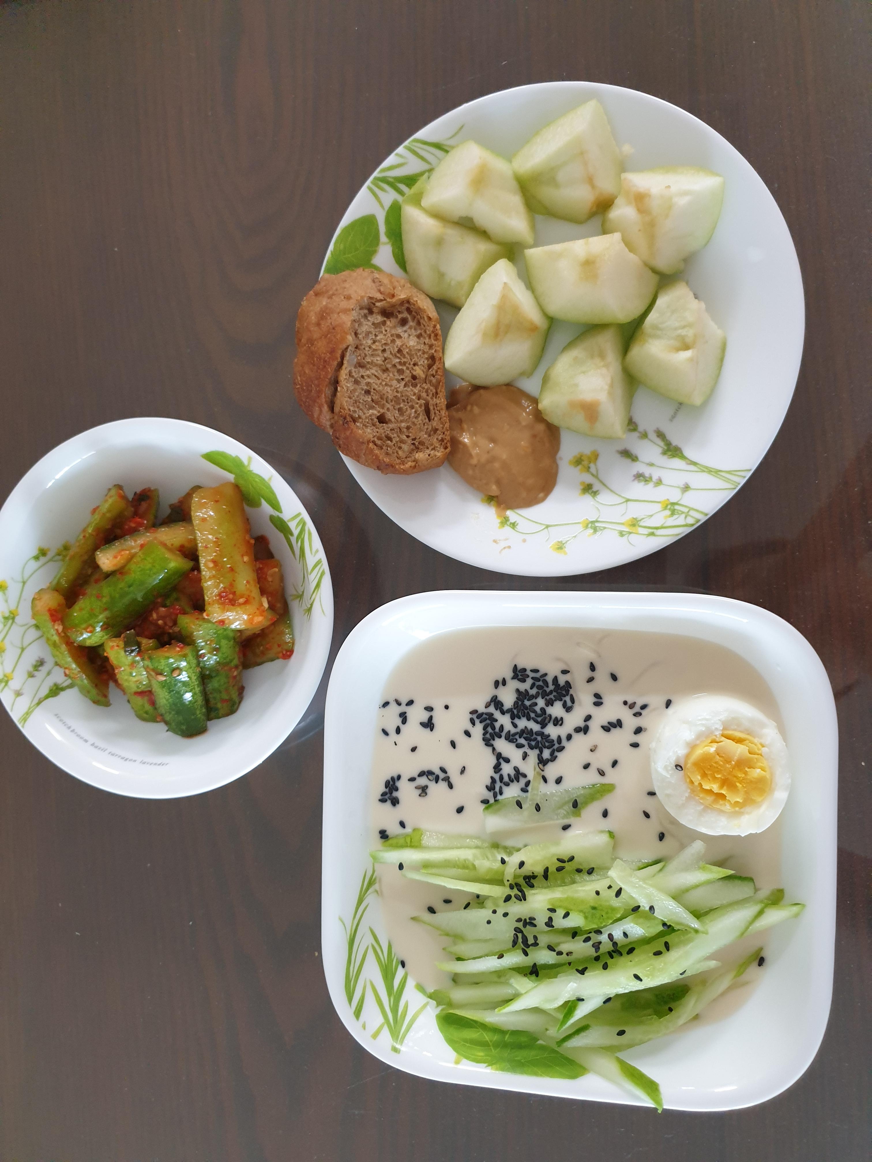 저녁 식사 메뉴는 콩나물 비빔밥이었습니다. 식사 직전에 오이 1/2개를 먼저 먹어 포만감을 높였습니다. 밥은 평소보다 적은 1/3공기만 넣고, 콩나물과 반찬 위주로 식사를 했습니다.
